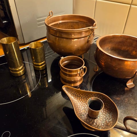 Gammelt hamret kobber. 300 per gjenstand, kr 1200 for alt.