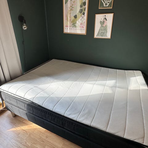 Jysk oppbevaringsseng i dobbel størrelse med grå tekstilramme. Sengen har løftemekanisme som gir oppbevaringsplass i hele sengebunnen, egnet for lagring av sengetøy, puter eller andre tekstiler eller klær. God lagringsplass og kan åpnes fra begge sider. Brukt selv til oppbevaring av klær, støvsuger, strykebrett, tørkestativ samt dyner og puter. Mål: Bredde: 150 cm, Lengde: 200 cm, Høyde: 66 cm. Kan få med overmadrass, men den har noen selvbruningsflekker, kan vaskes. 😅 Sengekappe kan også følge med om ønskelig (verdi på 2000kr). Originalpris på sengen er 20.000kr. Selges kan deles i 4 deler for enklere frakt, og kan monteres enkelt igjen.