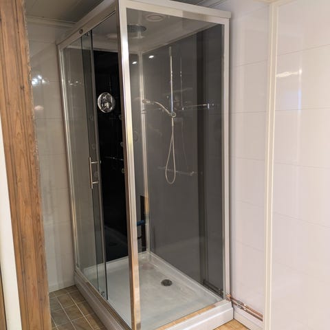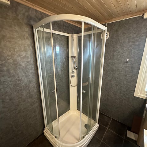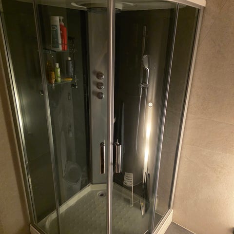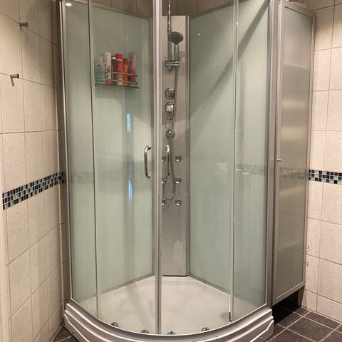 Dusjkabinett med integrert boblebad og massasjedyser. Kabinettet har buede skyvedører i glass, hånddusj på stang og et kontrollpanel for styring av funksjoner. I karet er det flere dyser plassert i bunn og sider, samt nakkestøtte. Svært lite brukt.