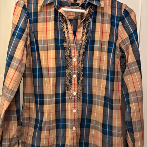 Tommy Hilfiger bluse for dame i størrelse 36. Blusen er i blå viskose med mønster i kontrastfarger. Den har lange ermer og knappelukking foran. Stoffet er lett og mykt, egnet til både hverdagsbruk og mer pyntede anledninger.