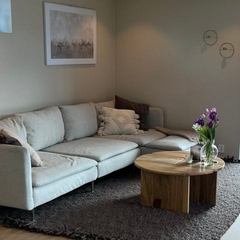Söderhamn sofa fra IKEA selges. Noen flekker men hele stoffet kan vaskes. Det er ingen flekkes som ikke går bort i vask. Kommer ikke til å vaskes før den selges da den er vasket for ikke lenge siden, og den trolig kan blir litt skitten under flytting. Det finnes flere deler som ikke viser på bilde: to rygger/armer til sofaen som kan skrus på om ønskelig. Det er en treseter og en ekstra puff. Puffen er egentlig en ekstra del og kan derfor brukes på flere måter da det som sagt følger med to ekstra bakdeler. Originalpris: rundt 12.600kr