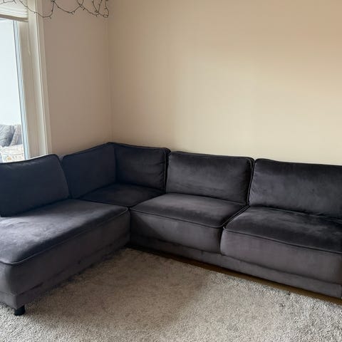 Pent brukt sofa med sjeselong i mørk grå farge selges.