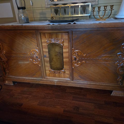 Kommode i mørkt tre med to dører og dekorative utskjæringer. Møbelet har buede ben og profilerte kanter, samt metallbeslag på dører og sider. Overflaten har finert trestruktur med mørk, varm tone. Egnet som oppbevaringsmøbel i stue, gang eller soverom. Klassisk og tradisjonelt. Dette møbelet ble i sin tid laget til mine oldeforeldre i bryllupsgave i 1911, i Trondheim.
