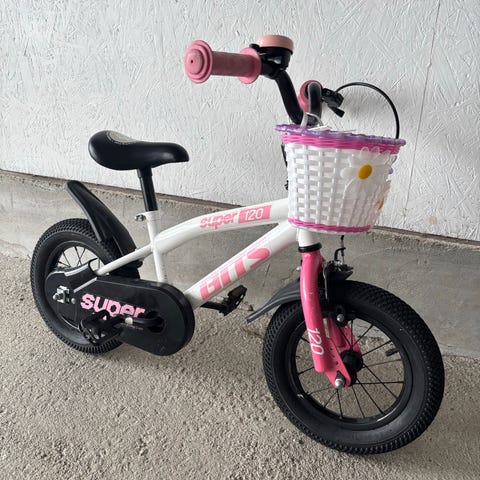 White barnesykkel 16" i blå og hvit farge med rosa detaljer. Sykkelen har 16-tommers hjul, kurv foran, heldekkende kjedekasse og skjermer foran og bak. Det følger med støttehjul som kan monteres ved behov.