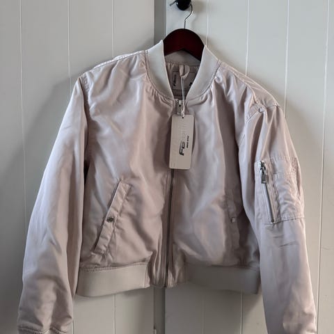 Ubrukt Donna jakke for dame i størrelse 38. Jakken er beige og laget i polyester. Modellen har ribbekant i halsen, glidelåslukking foran og to frontlommer med klaff og trykknapp. Passer som en lett ytterjakke i hverdagen.