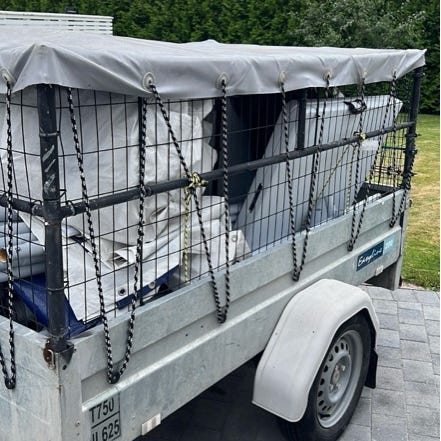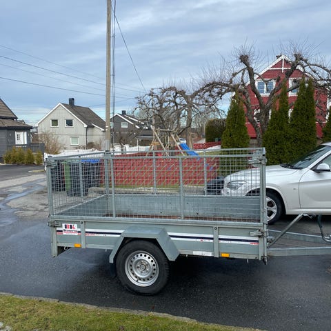 Tilhenger med to aksler og nettingkarmer. Hengeren har drag med påløpsbrems og støttehjul foran. Nettingkarmene gir god høyde for sikring av last. Egnet til transport av byggematerialer, hageavfall eller annet gods som trenger sidevegger for å holdes på plass. Karmer og chassis ser ut til å være i metall. Det følger med noe løst utstyr som vises på bildene, som kan fjernes eller beholdes etter behov.