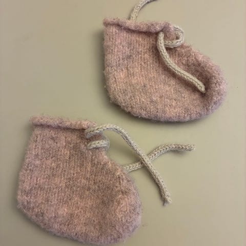 Håndstrikket og tovet tøffler til ny født. 100% ull