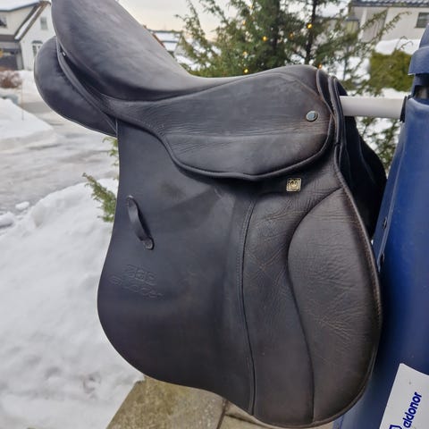 Eldre dressursal selges. Det er en Windsor Elite, 17" sete, brukt av hest med høy mange. Den ene hempen til gjordene er ødelagt, se bilde. Gjord og stigbøyleremmer, også eldre, kan medfølge.