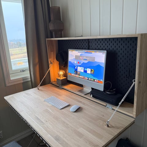 2021 modell iMac M1, 24 tommers skjerm, 8 GB minne, 256 GB SSD.