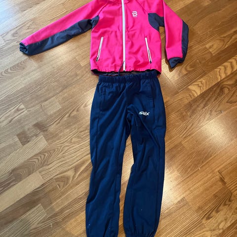 Dæhlie Junior treningsdress/skidress for barn i størrelse 140. Sett med jakke og bukse. Jakken er rød med glidelås foran, høy krage og elastikk nederst på ermene. Buksen er svart med glidelås nederst på bena. Begge deler har refleksdetaljer og logo. Egnet som trenings- eller skidress for barn.