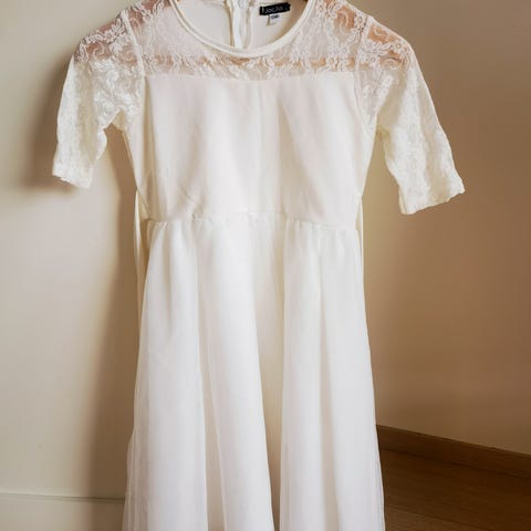 Hvit kjole med søte blomster. Størrelse 3xs som tilsvarer en 134. Selger den da den ikke passer lenger, kjøpt fra Wow. Sjekk mine andre annonser for flere barneklær. Ta kontakt om det er noe🤗