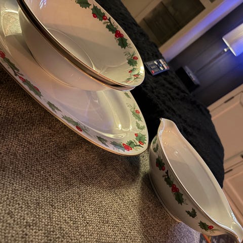 Kaffekopper, kaffeasjetter, middagstallerkener, et fat, to store boller, sausnebb og asjetter.