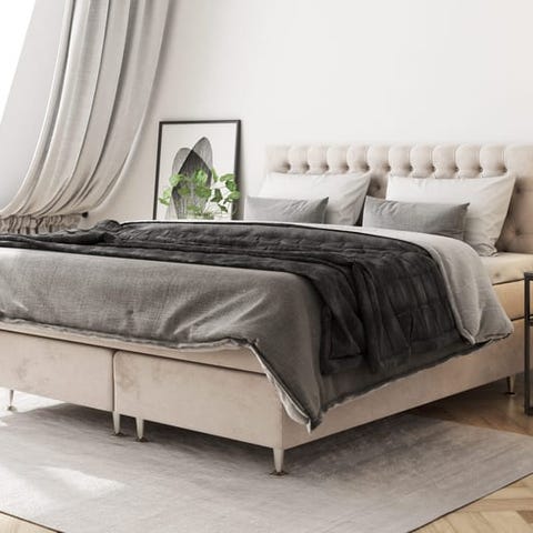Selger en stilren og elegant dobbeltseng med høy, polstret sengegavl samt to matchende nattbord. Sengen har en oppbevaringsdel under + sengebenk.