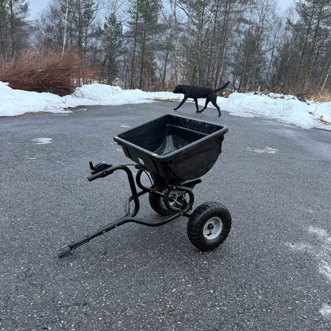 Liten effektiv sandspreder til å henge etter gressklipper eller annet motorisert kjøretøy