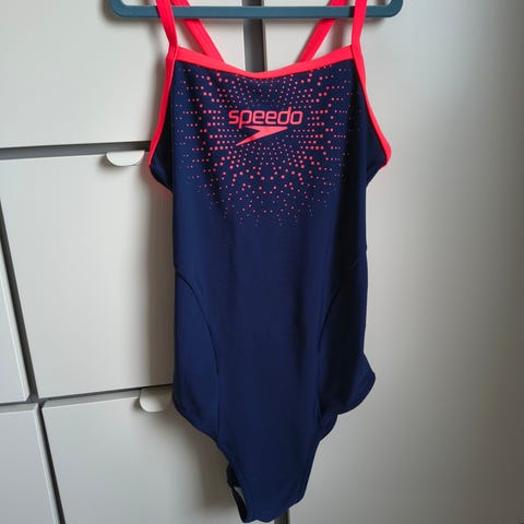 Speedo badedrakt for svømming til dame i størrelse S. Modellen er en klassisk, hel badedrakt med skulderstropper og middels høy skjæring. Fargen er marineblå med Speedo-logo foran og på siden. Badedrakten er laget i et elastisk syntetisk materiale som egner seg til trening og bruk i basseng. Passer til svømmetrening og generell bading.