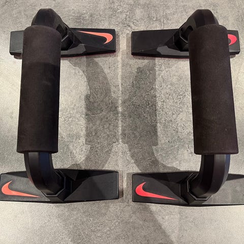 Nike push up bars i svart farge. Håndtakene har myk polstring for bedre grep og komfort under trening. Basene er stabile og rektangulære, med Nike-logo på sidene. Egnet til armhevinger og overkroppstrening hjemme eller på treningssenter.