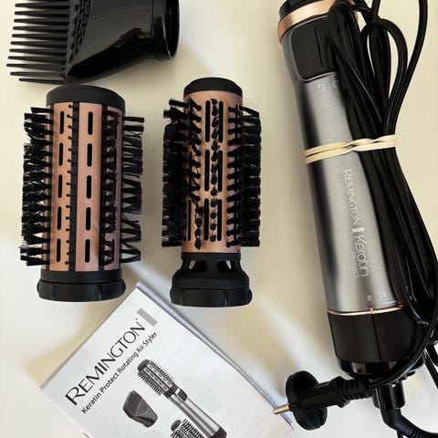 Remington Keratin Protect varmluftsbørste med flere utskiftbare børstehoder og kamtilbehør. Enheten har sylinderformet børste med varmeelement og luftuttak for samtidig tørking og styling av håret. Leveres med bruksanvisning og ekstra tilbehørsdeler som vises på bildene, egnet til forming og volum ved føning av hår.
