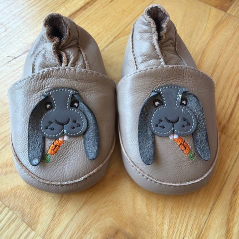 Søte skinntøfler, fine å lære å gå i. Med elefanter. Mykt skinn.