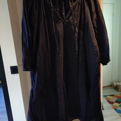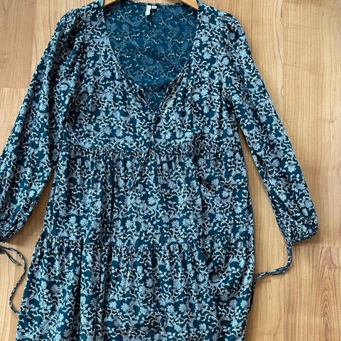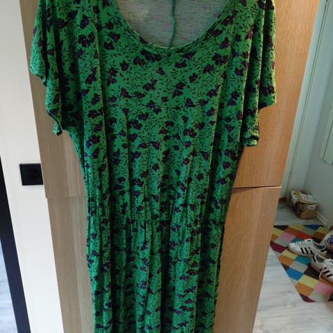 Indiska hverdagskjole for dame i størrelse XL. Kjolen er grønn med blomstermønster og er laget i viskose. Den har lange ermer med strikk ved mansjettene og v-utringning. Stoffet har rynket parti øverst som gir en lett og behagelig passform. Egnet som hverdagskjole og kan brukes både med strømpebukse og tights.