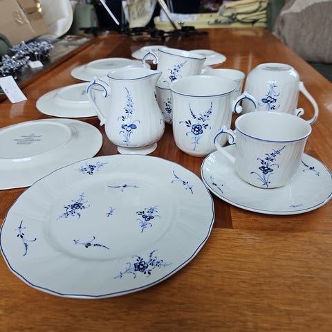 Firkløveren blåklokke: Sett med 8 stk. drikkeglass og et sausnebb med tilhørende fat. Glassene er gjennomsiktige med blåklokke dekor, og sausnebbet er hvitt med blåklokke dekor og står på et matchende fat. Egnet til servering av drikke og saus ved borddekking til hverdag eller selskap. Selges samlet.