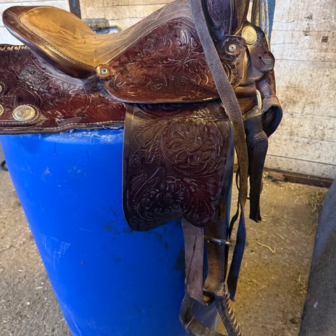 Vet ikke noe om rideutstyr. Dette er sal og noen reimer til hest. Ser ut som skinnet er bra men metallet er begynt å flasse litt. Må hentes.