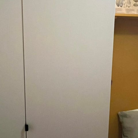 To av skapene har vært skrudd sammen og er derfor skruehull i sidene. Kan nok fint sparkles og males over. Et skap har et lite «hakk» i ene døren litt høyt oppe. Se bilder.