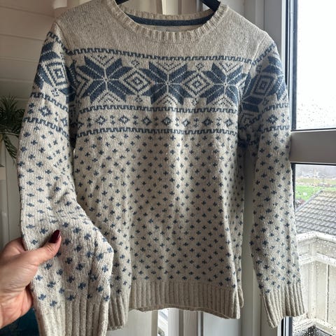 Jean Paul genser for dame i størrelse M. Genseren er i ull og har et flerfarget mønster i blått og hvitt. Rund hals med ribbestrikket kant, samt ribbestrikk nederst og på ermene. Passer til hverdagsbruk og som et varmt lag på kjølige dager.