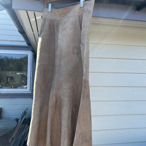 Vintage Munthe plus Simonsen skjørt i semsket skinn. Str. 40. Skjørtet er i beige skinn med dekorative sømmer og påsydde lommer foran. Bred linning med knappelukking i metall foran. Skjørtet er helfôret med glatt polyesterfôr. Materiale: 100 % skinn (svineskinn), fôr i 100 % polyester.