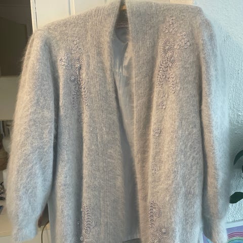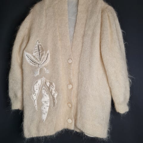 Flott vintage ulljakke med nydelig perlebroderi. Megakul over både bukser og kjoler. Skulderputer og lommer. Går til litt ned på låret. Nydelig med 80% angoraull, 10% ull og 10% nylon. I veldig fin stand. Selges da den dessverre bare blir hengende i skapet og fortjener at noen andre bruker den. Står ingen størrelse men den føles som en L. Passer til L og til M hvis man vil ha den litt oversized. Jeg selv er M-L.
