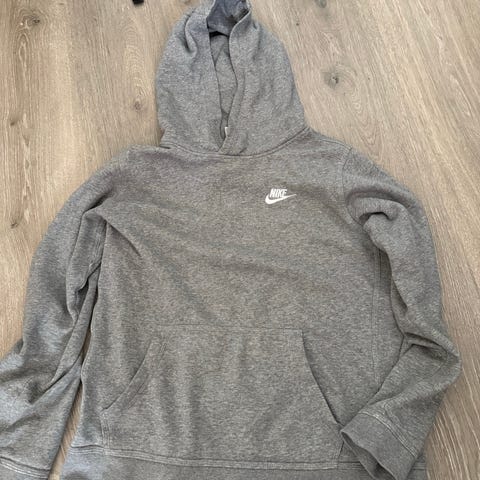 Nike hettegenser for herre i størrelse S. Genseren er grå og har justerbar hette med snøring. Den er laget hovedsakelig av bomull, med myk innside for økt komfort. Liten Nike-logo er plassert på brystet. Passer til hverdagsbruk og lett trening.