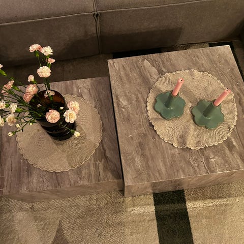 Dice sofabord sett i fargen travertin grå, kjøpt hos Bohus for et par år siden (lite brukt) i noen hjørner har fargen sluppet. Selges derfor til veldig redusert pris.