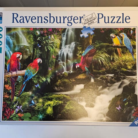 1) Ravensburger puslespill 500 brikker med motiv av tropisk foss i solnedgang. Vertikalt motiv med fossefall omgitt av tett, grønn vegetasjon og fargerike planter.