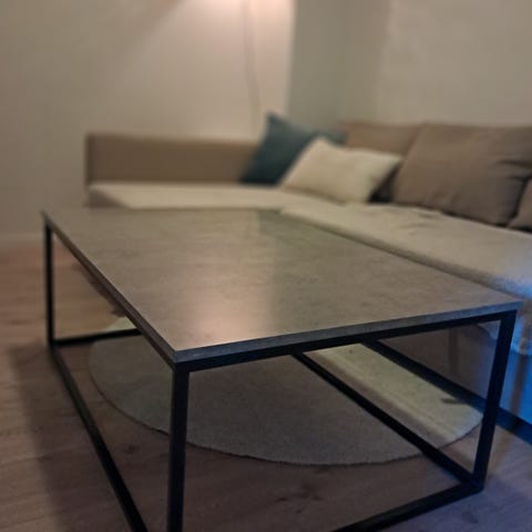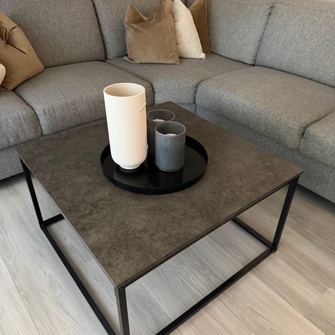Pent, elegant og solid salongbord. Svart metall ramme og det jeg antar er en sponplate kledd som betong. Normal bruksslitasje, men ingen store synlige skrammer. Pris kan diskuteres ved rask henting, må hentes i Lillehammer :)