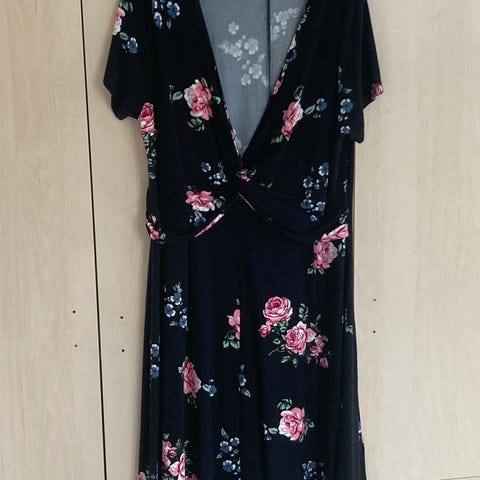 Fin kort kjole. Svart med rosa blomster. Vhals. Str. XL ( curvie). Ny, ikke brukt.