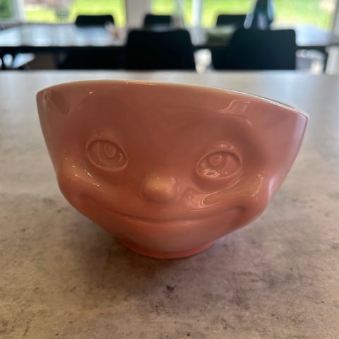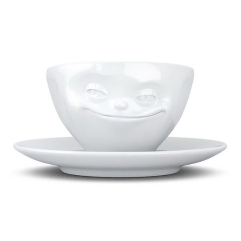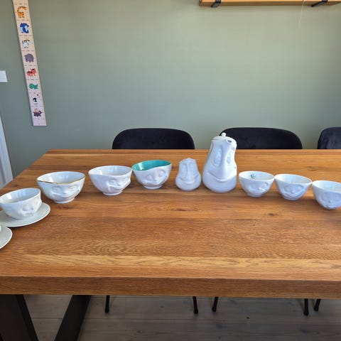 Den andre koppen er hvit med formet ansiktsmotiv og tilhørende hvit skål.