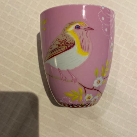 Den ene koppen har rosa dekor med fuglemotiv og tilhørende rosa skål med mønster.