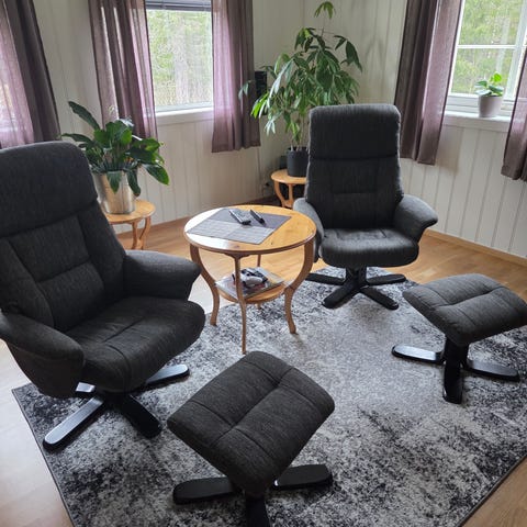 Pent brukte lenestoler med tilhørende krakker. Brunt stoff. Meget pent brukt. Ingen synlig slitasje. Avtagbare nakkeputer. Bredde 68 cm. Rundt bord følger også med, Bredde 60 cm, høyde 60 cm. En liten bit av list på kanten av bordet mangler ( se bilde ).