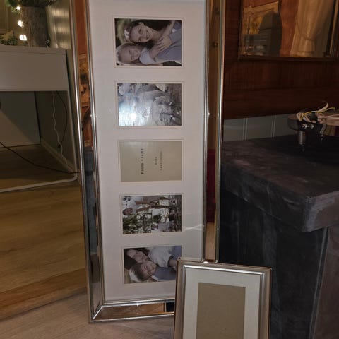 Skade på ene rammen, delen ligger inni bilde, mulig det kan limes. Se bilde.