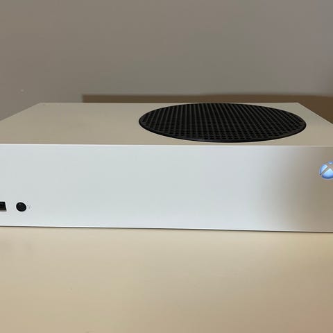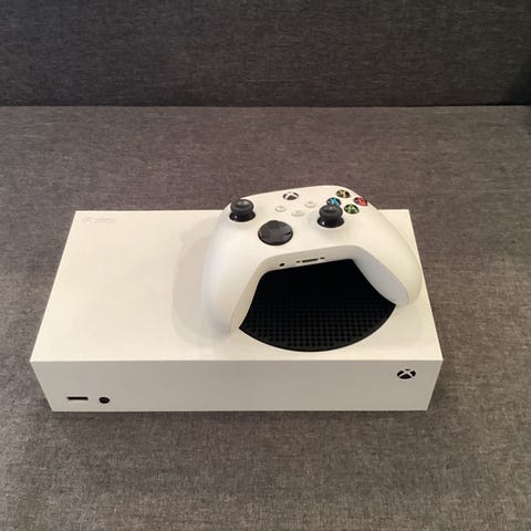 Microsoft Xbox Series S spillkonsoll i hvit farge. Følger med en hvit kontroller.