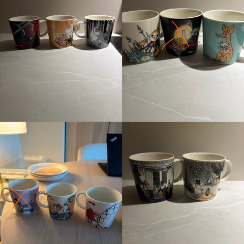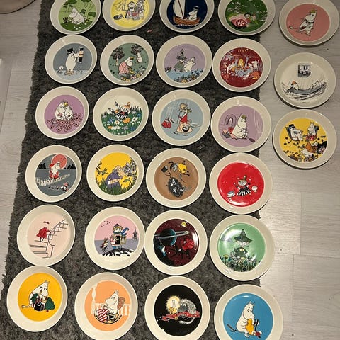 Arabia Mummi tallerkener i keramikk med ulike Mummi-motiv.