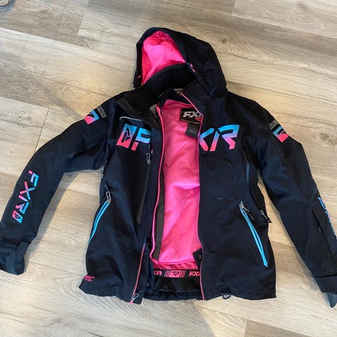 FXR Ride Div jakke i blå og svart farge. Jakken har stort FXR-logo-trykk foran, bak og på ermene. Modellen har høy krage og glidelås i front, samt elastisk avslutning nederst og ved håndledd. Egnet som ytterjakke, for eksempel til snøscooterkjøring eller annen utendørs bruk i kaldt vær.