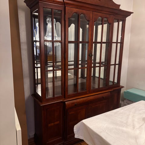 Vitrineskap i tre med øvre del med glassdører og sprosser. Skapet har flere hyller bak glassdørene som egner seg til oppbevaring og visning av servise, glass og pyntegjenstander. Nedre del består av skuffer og skap med tette dører for lukket oppbevaring. Klassisk utførelse i treverk med profilerte fronter og metallhåndtak. Passer til bruk i stue eller spisestue som oppbevarings- og utstillingsmøbel.