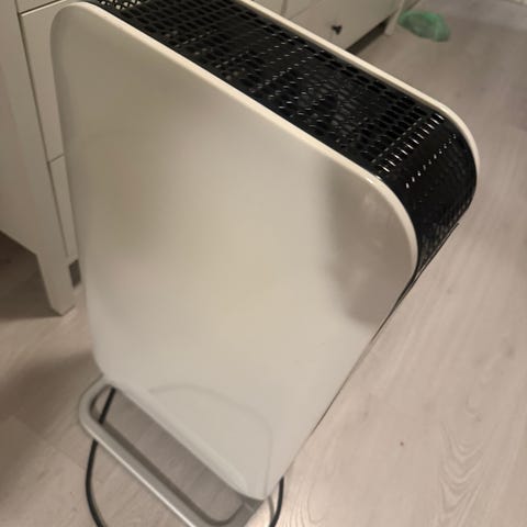 Mill panelovn i hvit utførelse med frittstående gulvstativ. Ovnen har digitalt display og betjeningspanel i front, samt strømtilkobling bak. Egner seg for oppvarming av innendørs rom og kan plasseres på gulv der det er behov for ekstra varme. Designet er avrundet med glatt front og metallstativ som gir stabil plassering på gulvet.