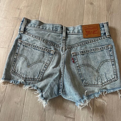 Denimshorts for dame i størrelse XS. Shortsen er i blå denim med fine og kule frynsete detaljer. Klassisk 5-lommersmodell med beltehemper, knapp og glidelås i front. Materiale i denim (bomull). Passer til hverdagsbruk i varme sesonger.