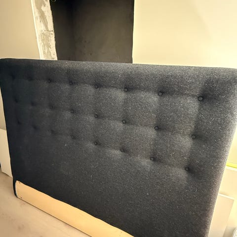 Bohus sengegavl i grått tekstil selges. Sengegavlen har trukket stoff med knappestikninger som gir et rutemønster. Passer som ryggstøtte når man sitter i sengen, og som avgrensning mellom seng og vegg. Egnet til bruk i kombinasjon med ulike typer sengestammer og madrasser i tilsvarende bredde.