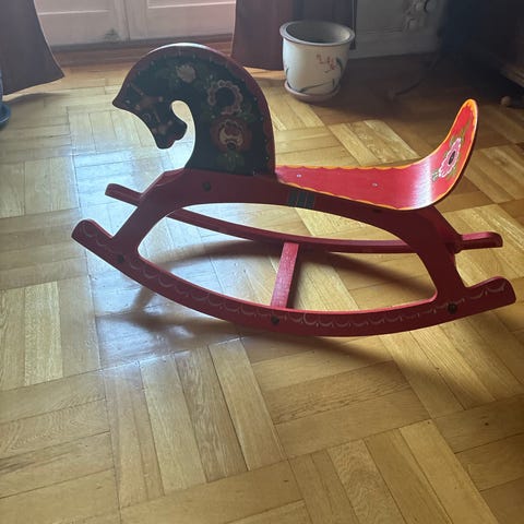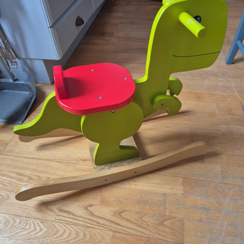 Fargerik og solid gyngesjiraff som barnet kan sitte og gynge på. Passer fint fra ca. 1 år, avhengig av barnets motorikk og balanse. Gir god mulighet for aktiv lek inne, trening av balanse og grovmotorikk, og er veldig populær hos de minste. Brukt av to barn og i normal brukt stand – noen små riper og merker i plasten, men alt fungerer som det skal. Ingen løse deler. Pakken kan følge med.