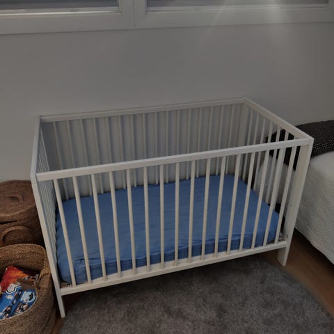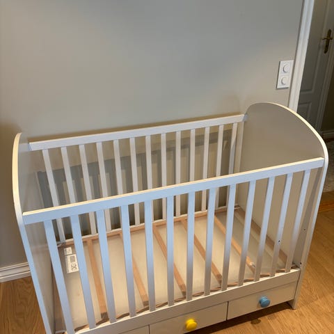 IKEA sprinkelseng i hvit farge. Klassisk rektangulær barneseng med sprosser på alle sider. Sengen har flat sengebunn og rette ben. Egnet for baby og småbarn innenfor standard mål for sprinkelsenger (ca. 60 x 120 cm, se mål på tegning). Etter hvert som babyen blir større kan du flytte sengebunnen ned og fjerne en av langsidene. Passer på barnerom eller soverom som fast seng til spedbarn og mindre barn. Madrass medfølger.