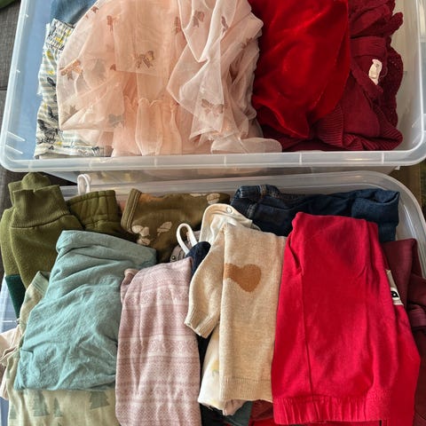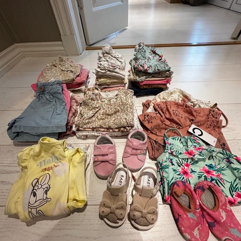 Enkelte bruksmerker, men mye bruk igjen. En kjole, to pysj, 10 bodyer, 5 bukser, et sett med bukse og genser. Newbie, Zara, Gap, HM, Kappahl.