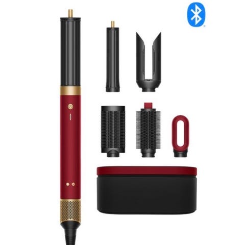 Dyson Airwrap Complete hårstyler i sølv/rosa med flere utskiftbare munnstykker og børster. Settet inkluderer baseenhet, ulike krølltønner, glattebørster, rundbørste og fønemunnstykke. Leveres i et oppbevaringsetui. Egnet for styling og tørking av hår med ulike frisyrer og finish.