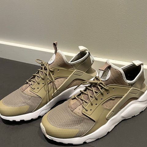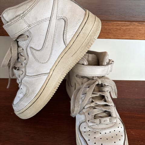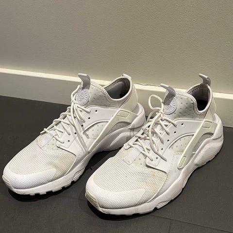 Nike Air sneakers i størrelse 43. Høymodell joggesko i hvit farge med snøring og borrelåsrem ved ankelen. Overdel i syntetisk materiale med perforert tåparti for ventilasjon. Yttersåle i gummi med mønster for grep. Passer til hverdagsbruk og fritidsaktiviteter.